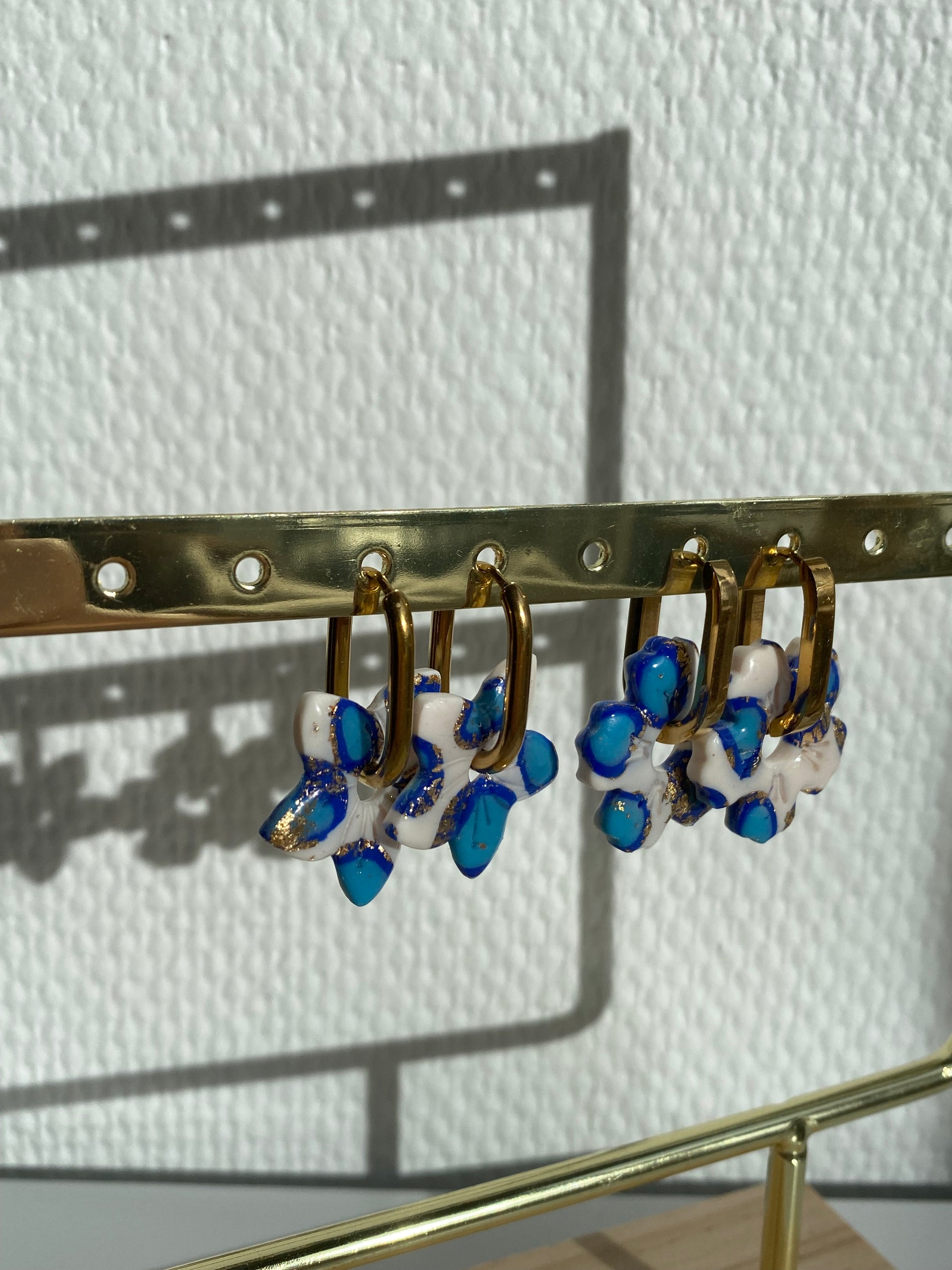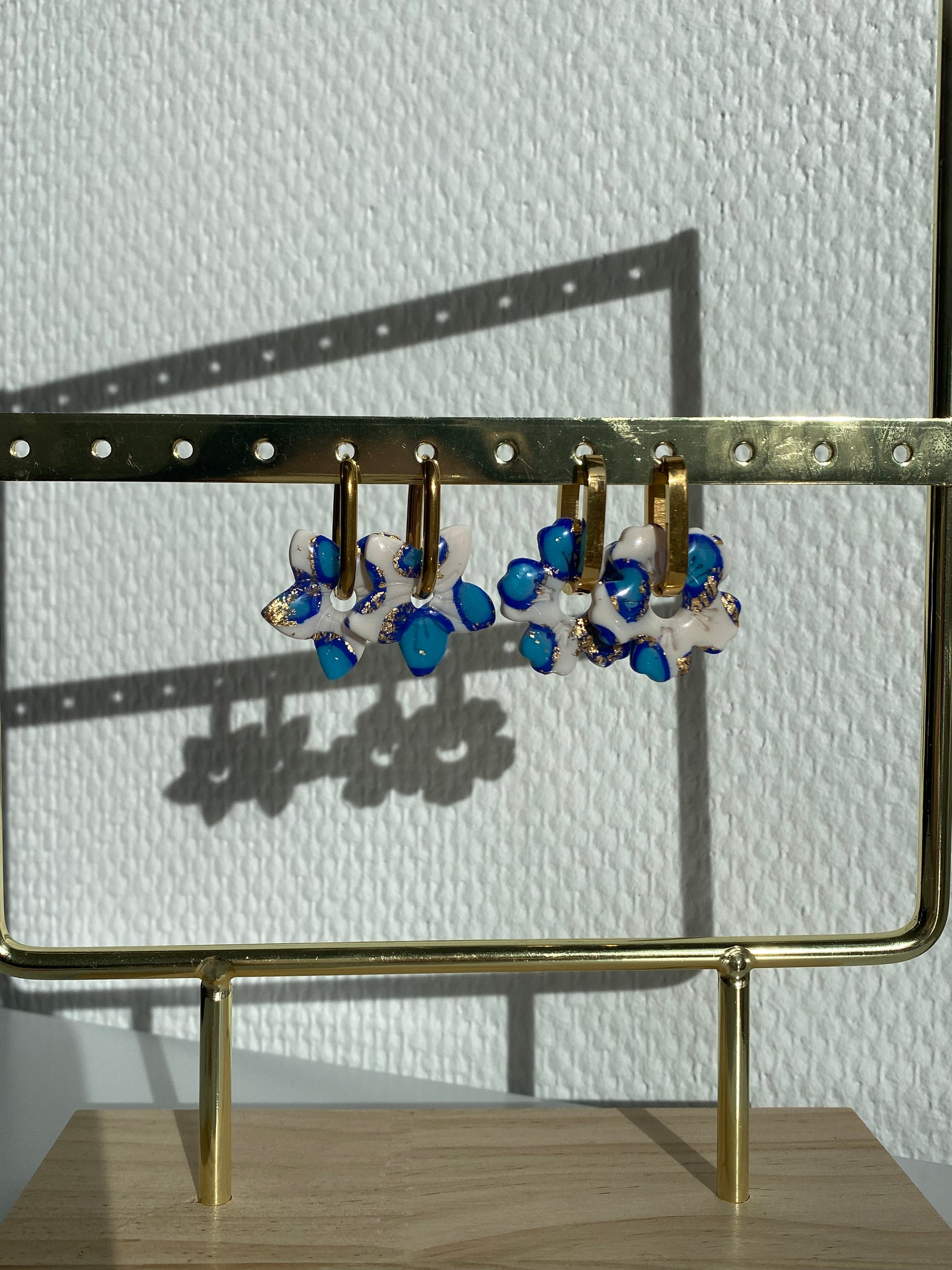 Dans une forme de fleur classique ou de fleur exotique ( bout pointu). Vendues par paires sans créoles. Présentées sur le portant avec les créoles Abby et Claire.