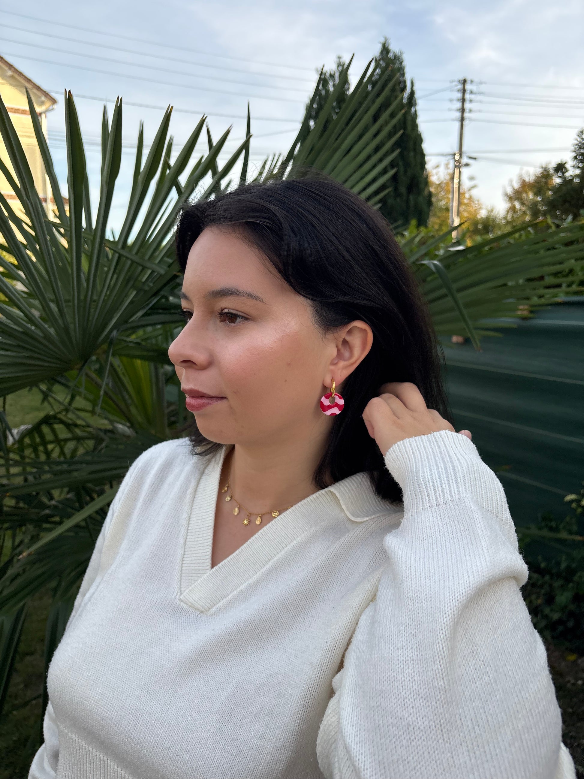 Une paire de boucles d’oreilles complètes cerise et rose, motif vagues ( créoles doré ou argenté )