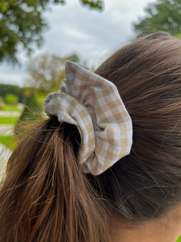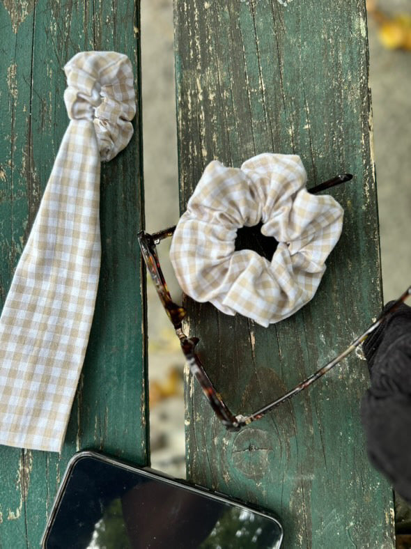 Un chouchou et deux lingettes réutilisables Vichy cousus à la main par L’Accessoire ML.