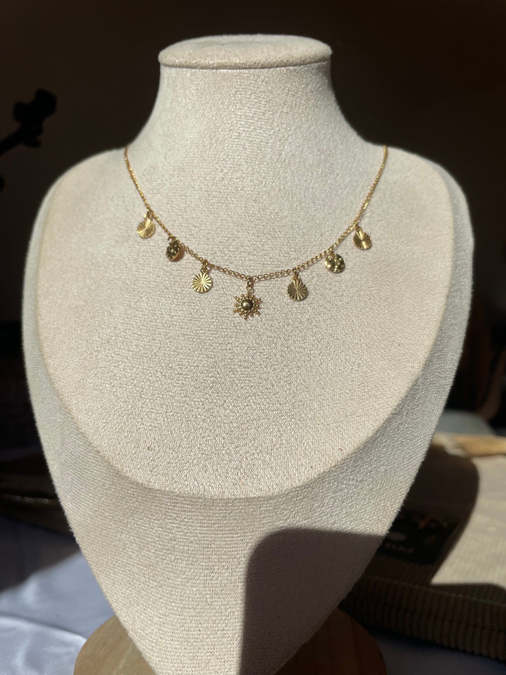 Un collier fin en acier inoxydable (35 à 40 cm, doré ou argenté), orné d’un petit soleil et de breloques, assemblé à la main