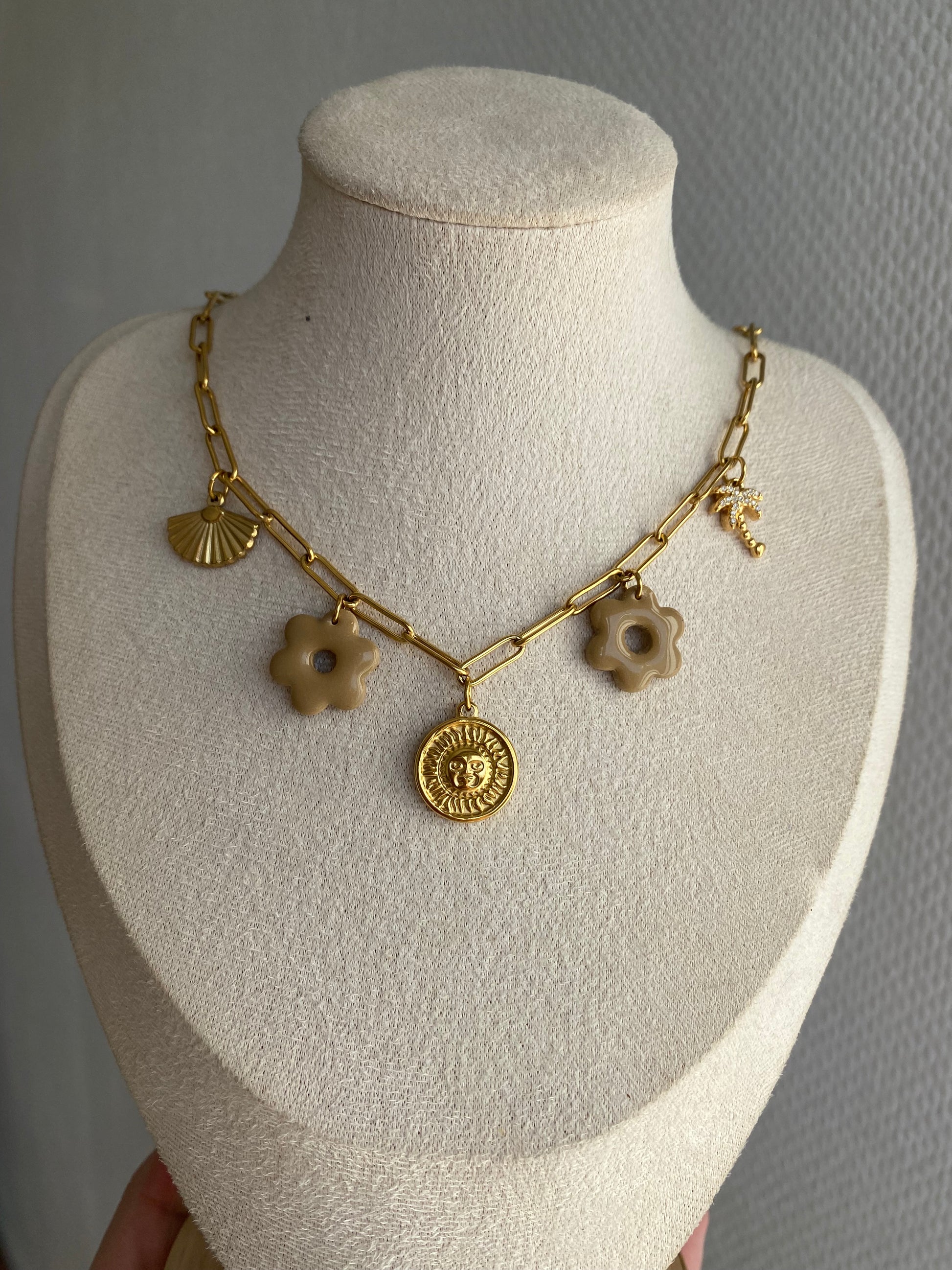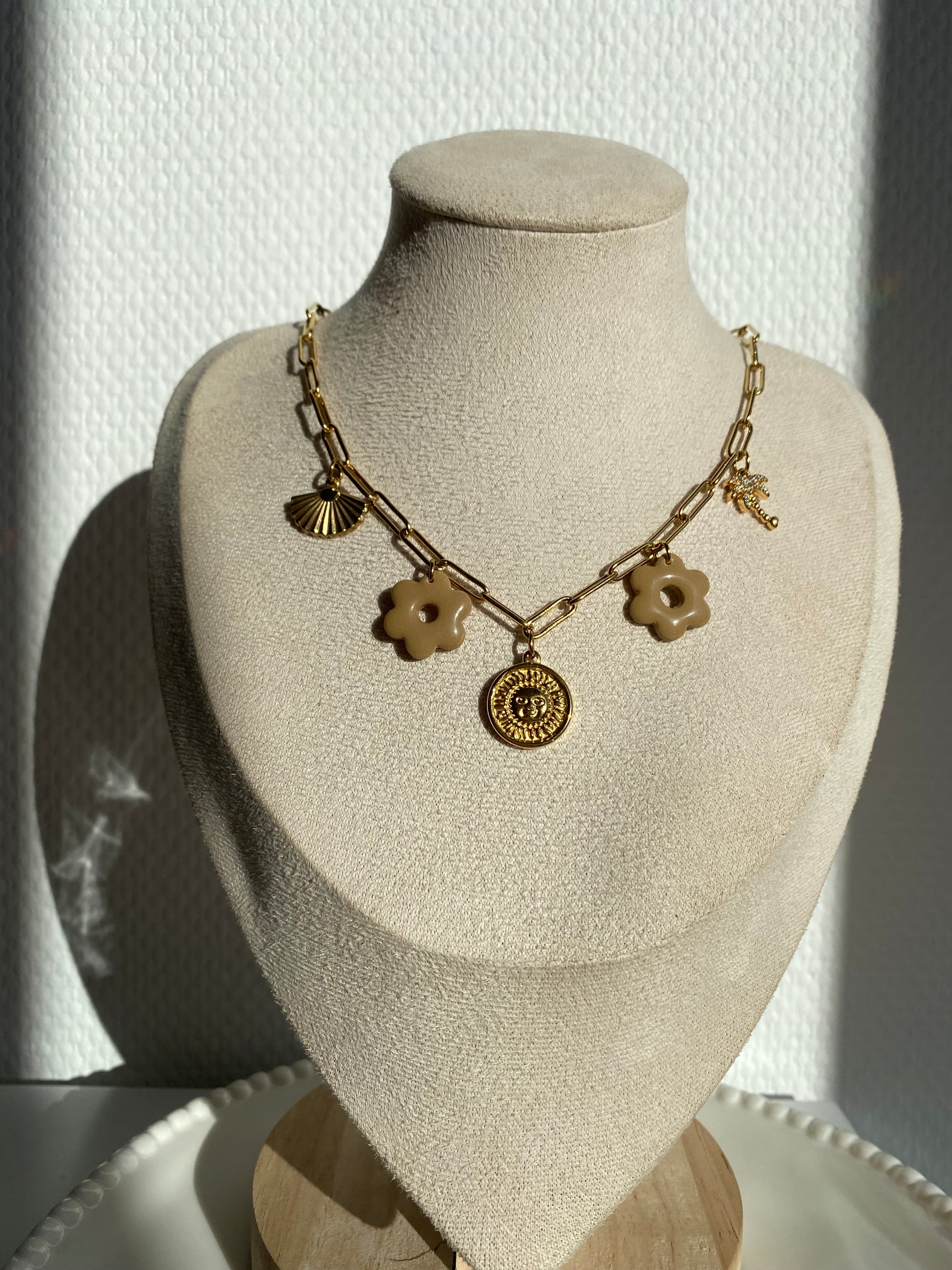 Un collier doux et floral grâce à ses petites fleurs en pate polymère beige fabriqué à la main.