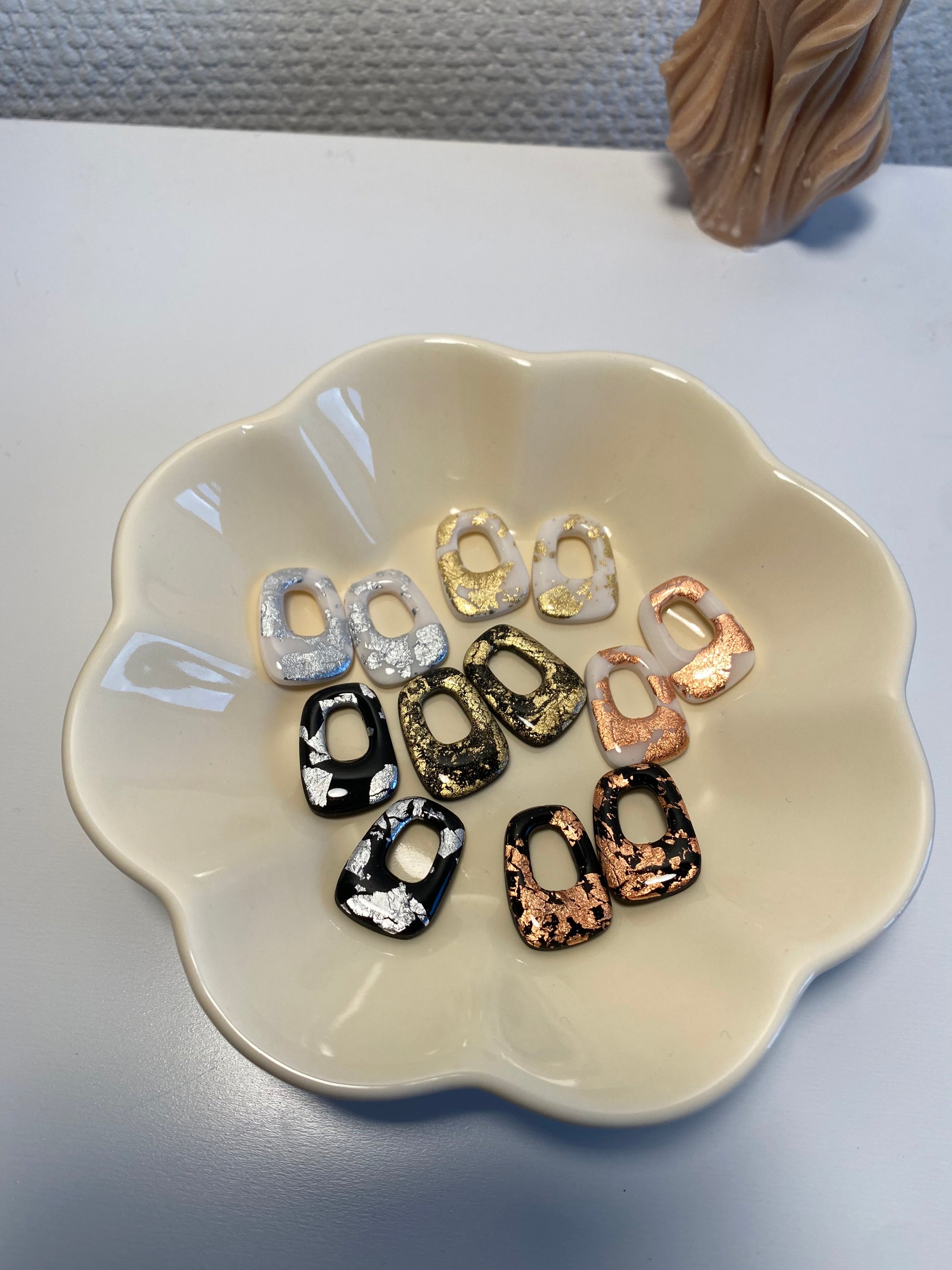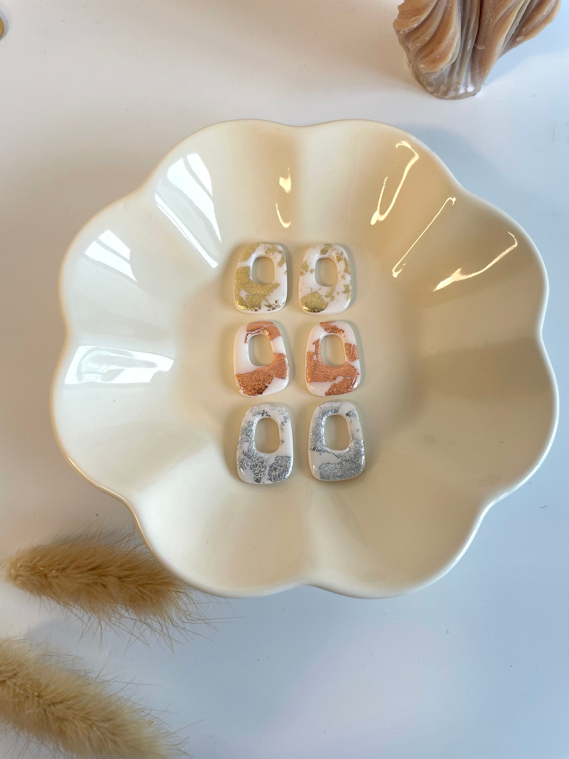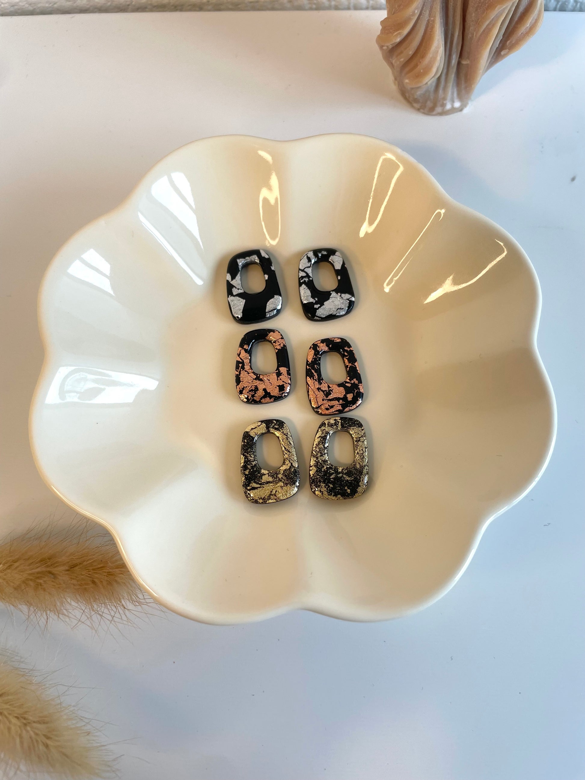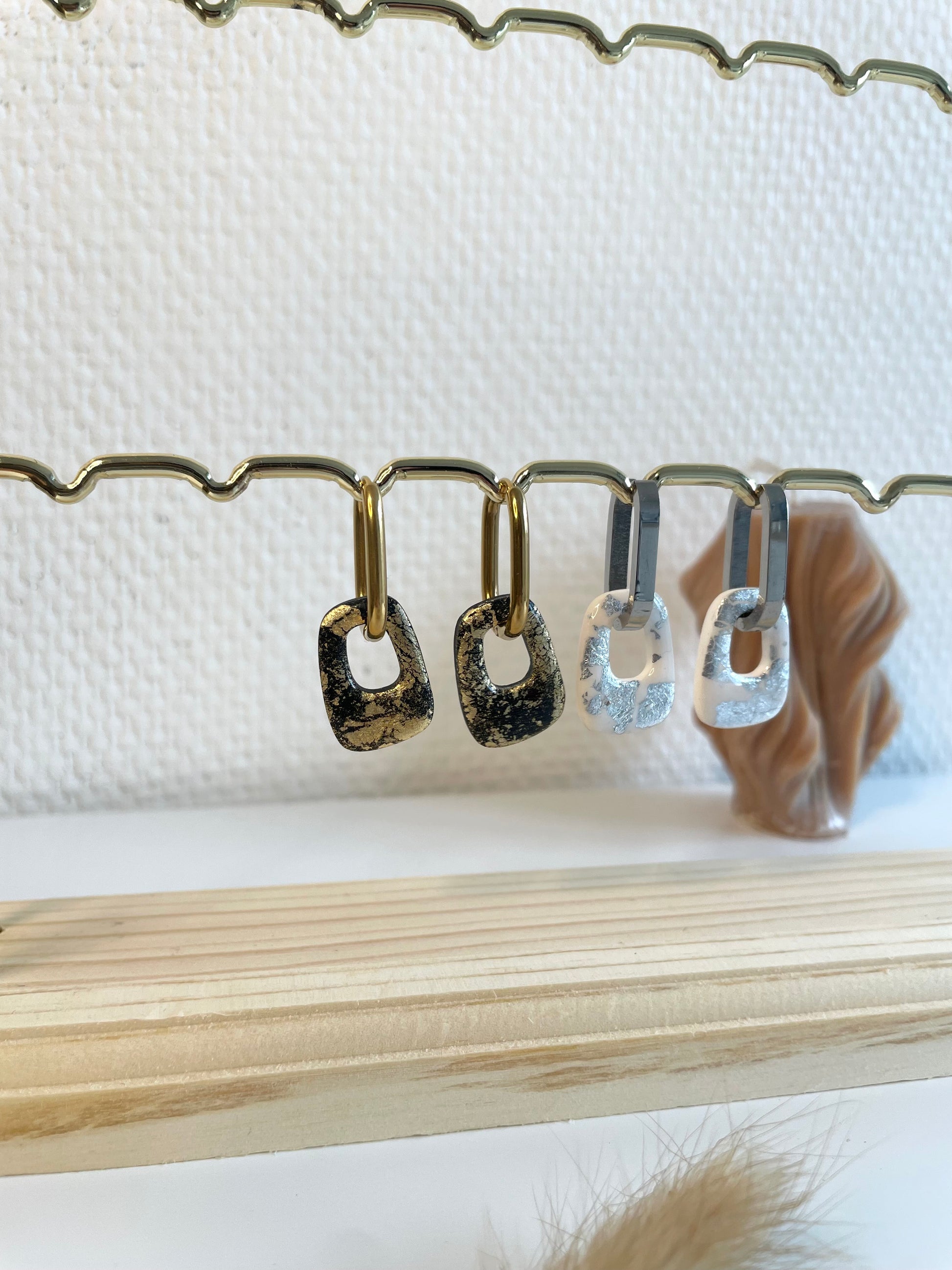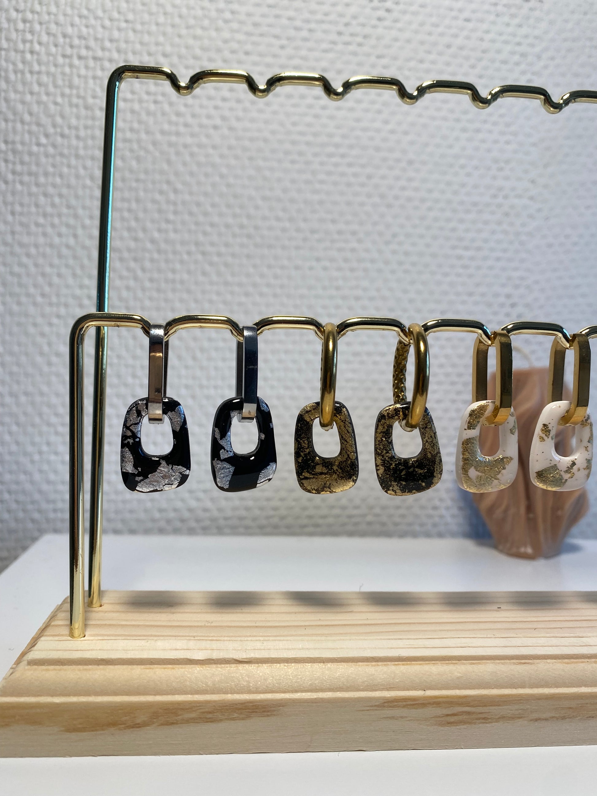 Découvrez les Héléna, nos breloques chic avec de jolis détails dorés, argenté ou rose gold. Elles sont présentés sur le portant avec les créoles Abby et Claire.