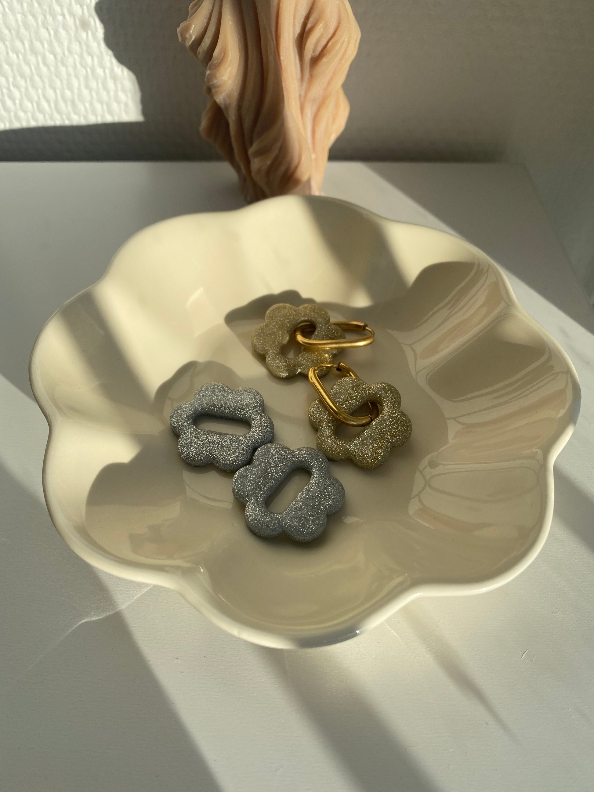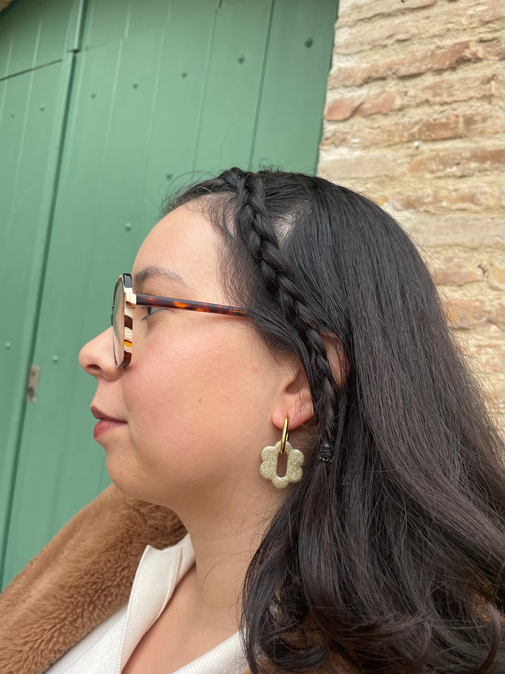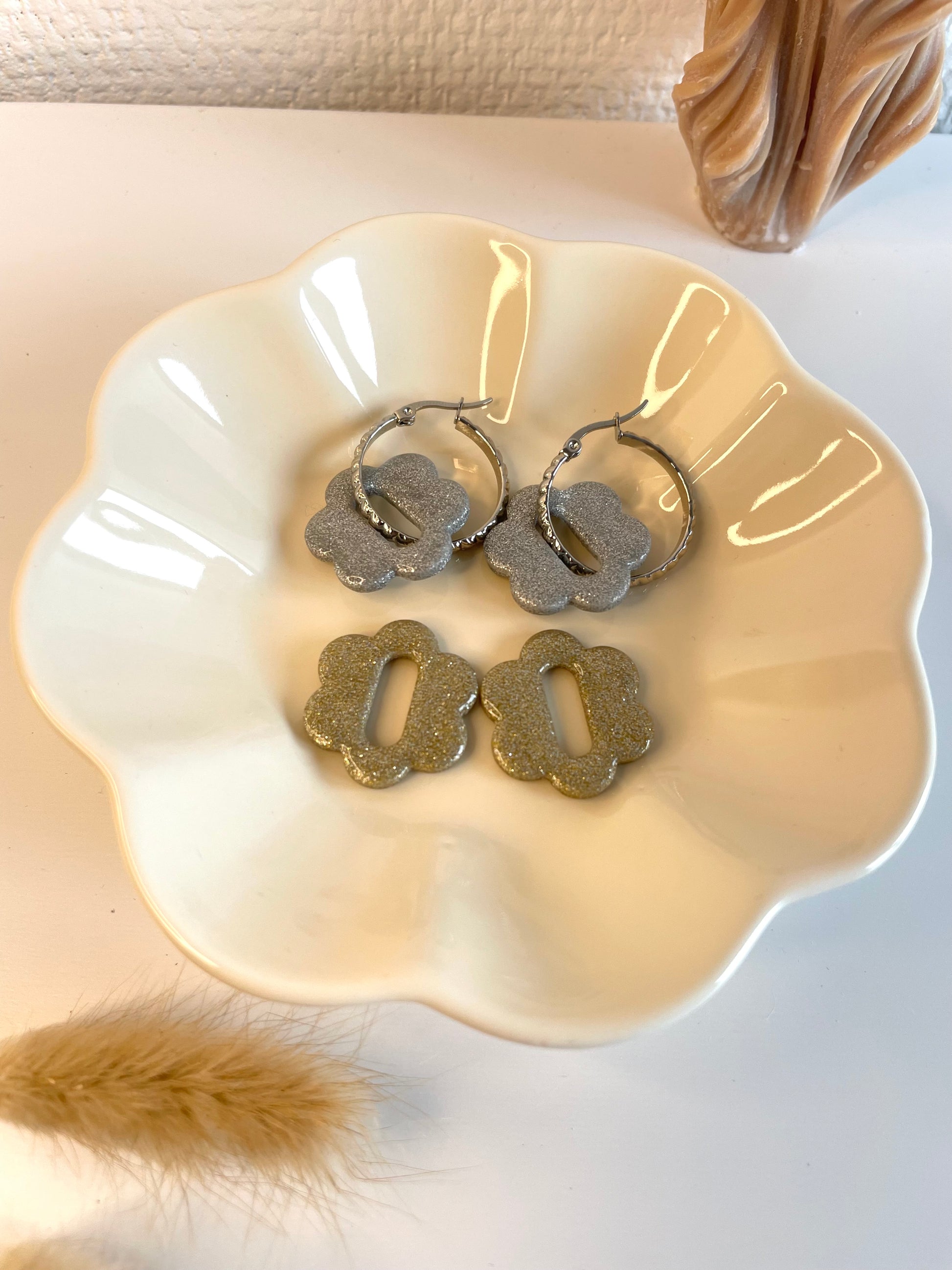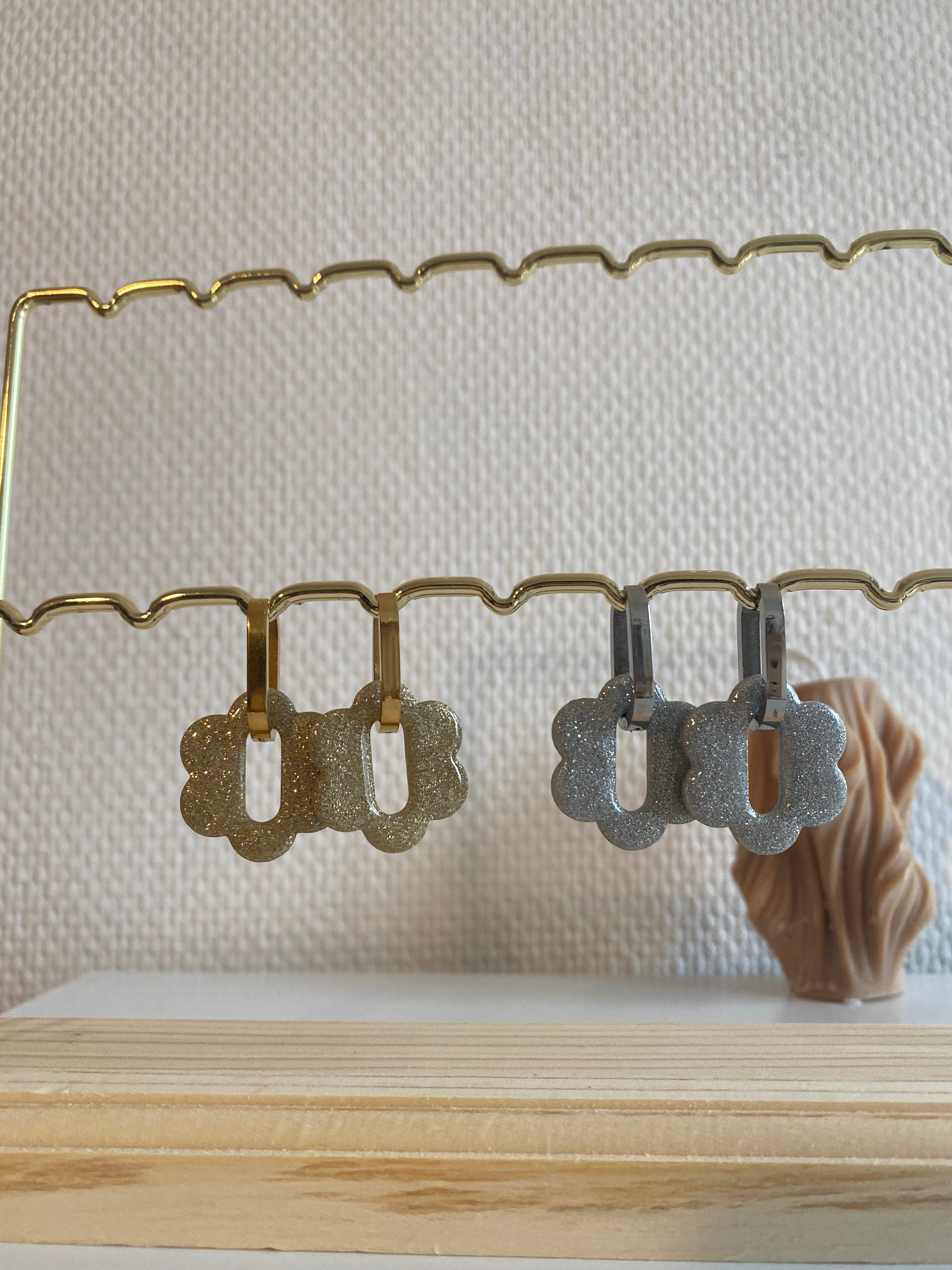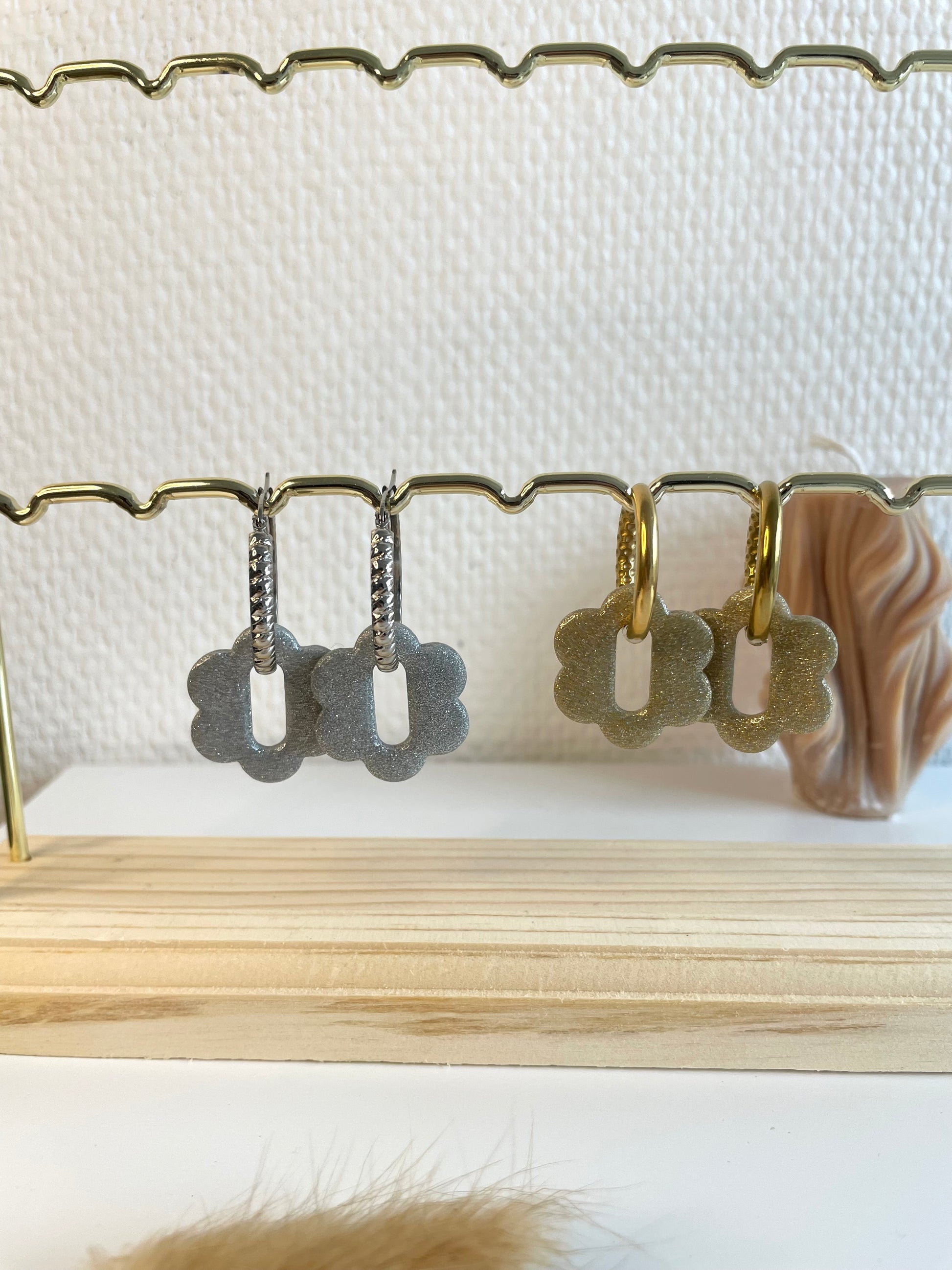 Découvrez les Laure, nos toutes nouvelles fleurs interchangeables pailletées. Elles sont présentés sur le portant avec les créoles Noémia et Francoise. Elles sont portés sur la photo avec les créoles Abby.