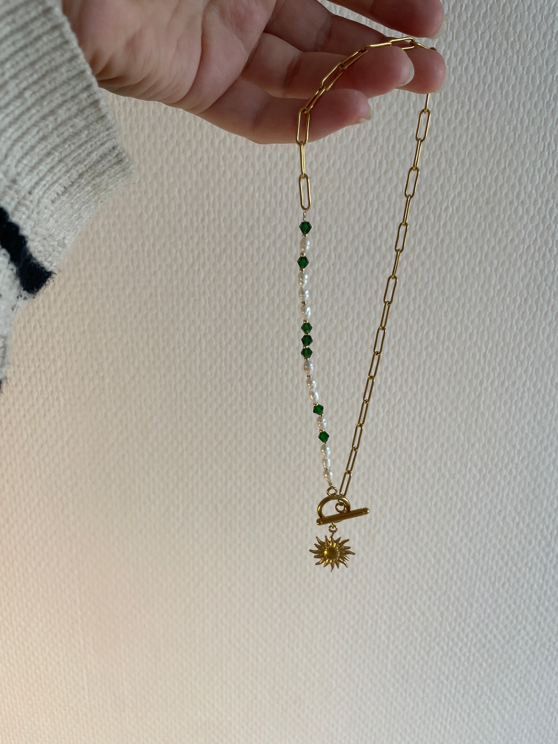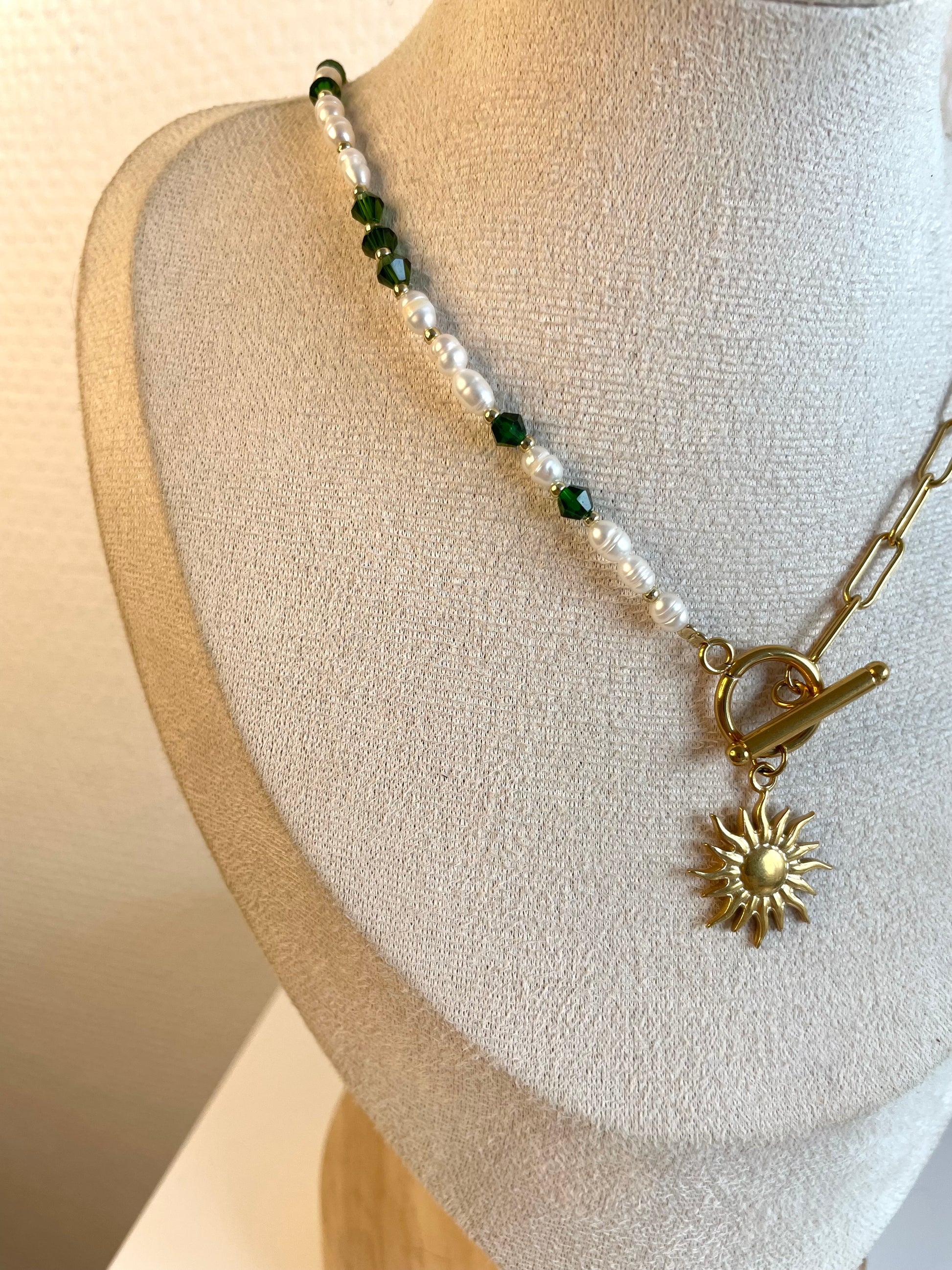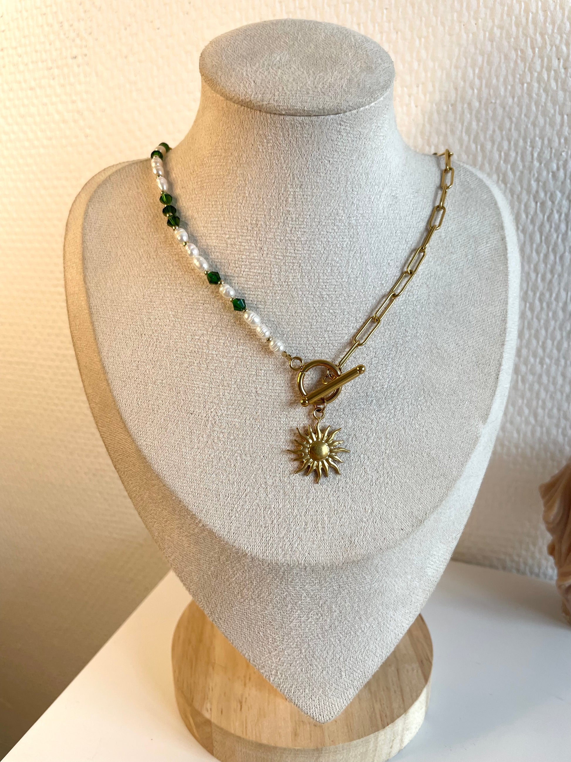 Envie d'un collier unique : le collier Laurie est une création exclusive en un seul exemplaire en acier inoxydable, en perles d'eau douce et en perles de verres vert sapin avec un joli pendentif en forme de soleil.