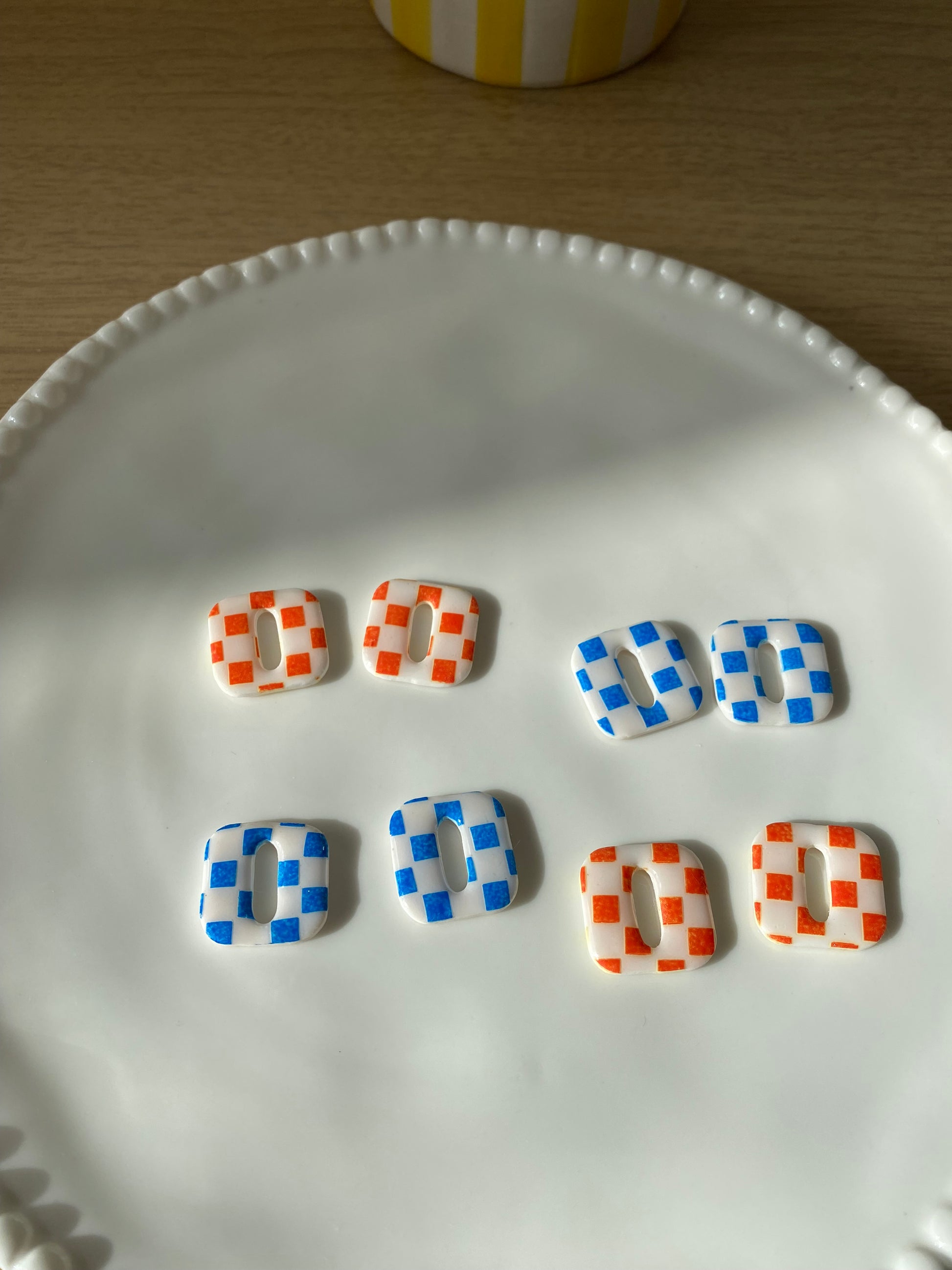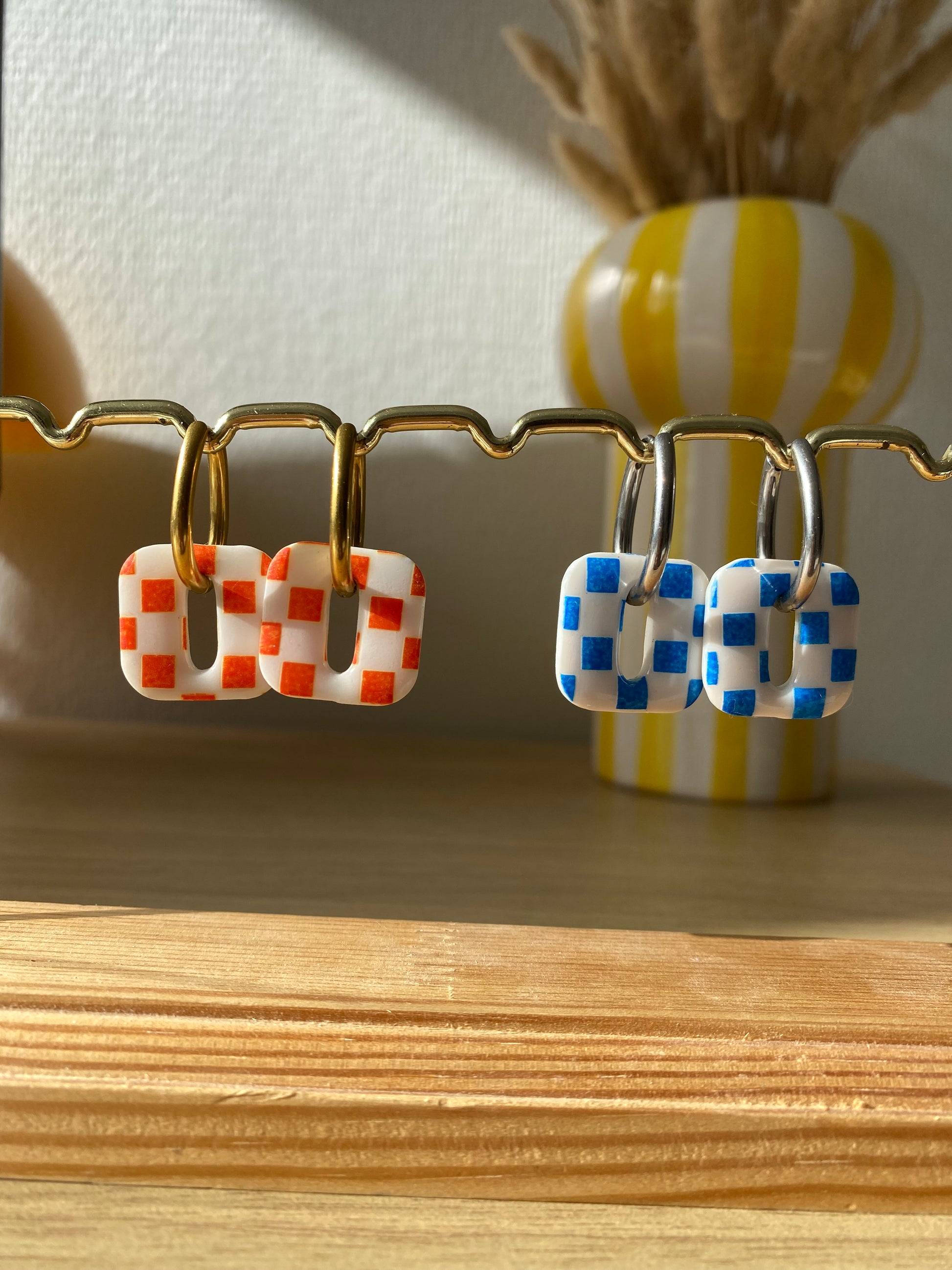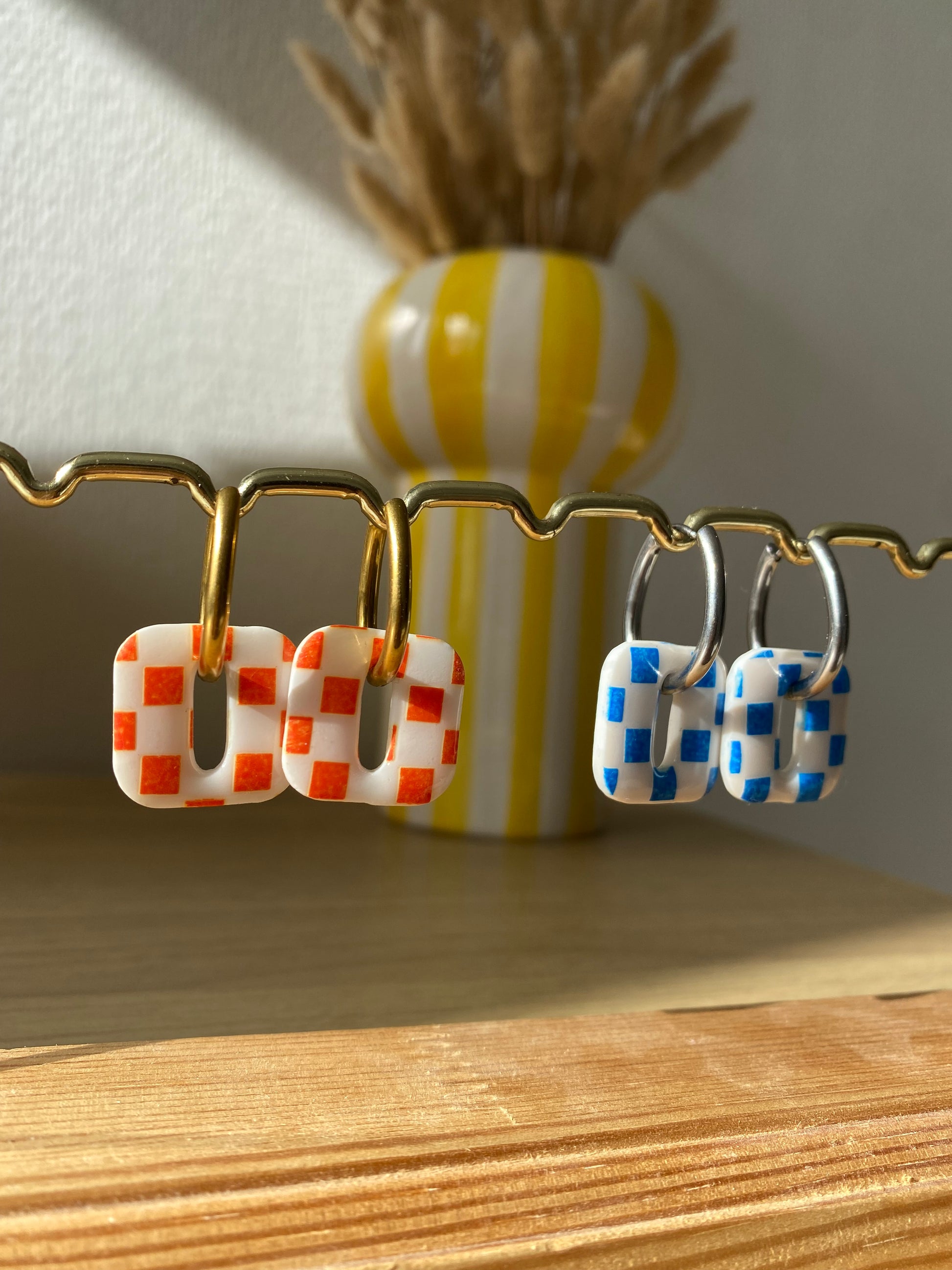 Envie d'une paire tendance et coloré pour pimper tes créoles ? Alors tu vas adorer les breloques Billie. Faite en pate polymère blanche avec de la peinture bleu ou orange.