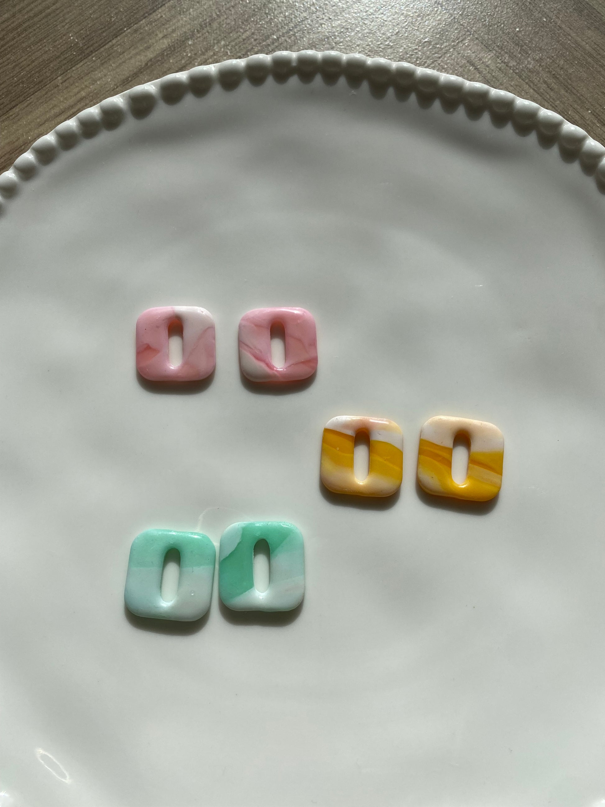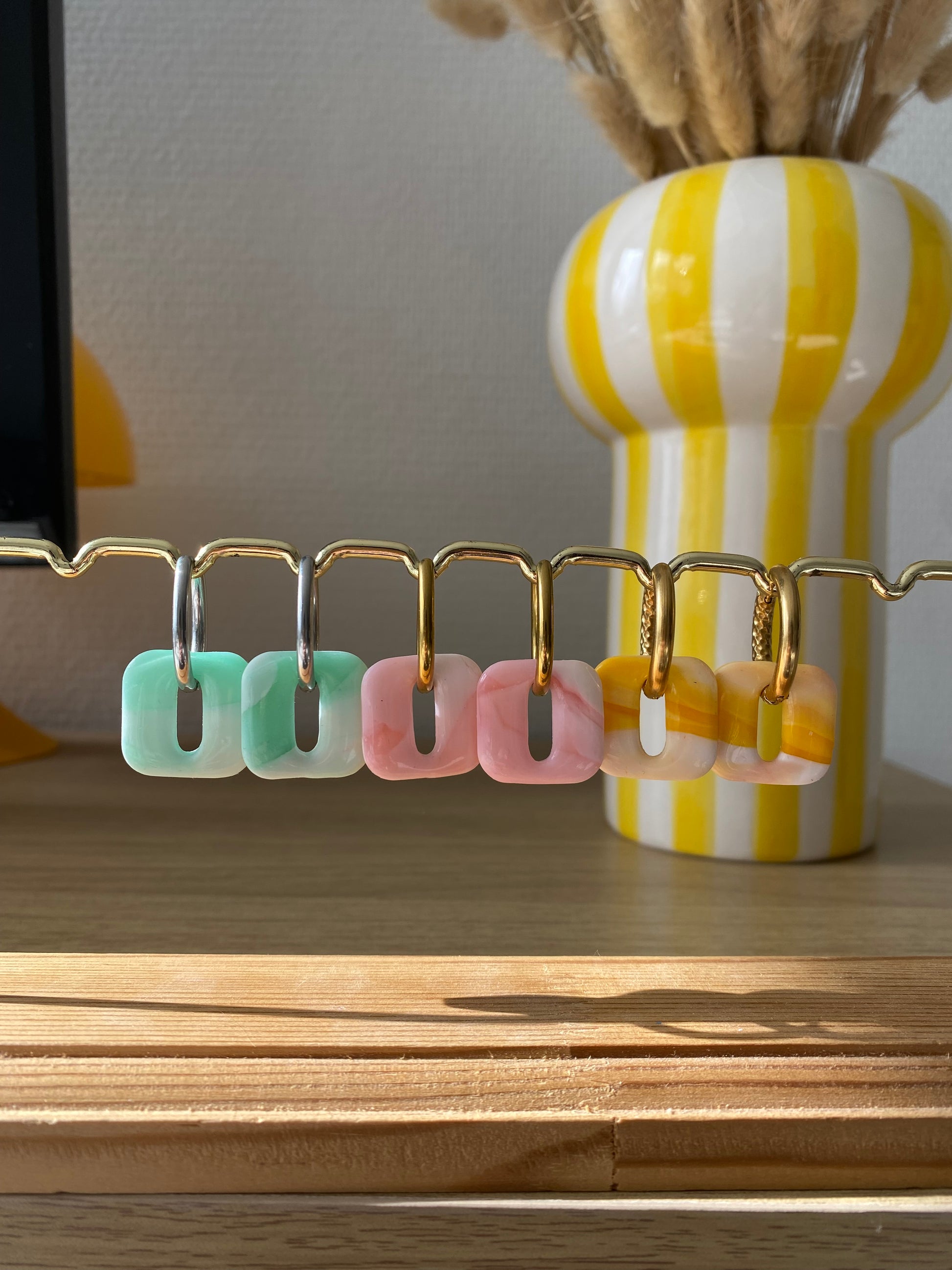 Envie d'une paire originales, élégantes avec une touche de couleur? Les breloques Ilona sont faites pour toi. Fabriquées en pate polymère dans un joli mélange blanc et translucide rose, orange/jaune ou vert.