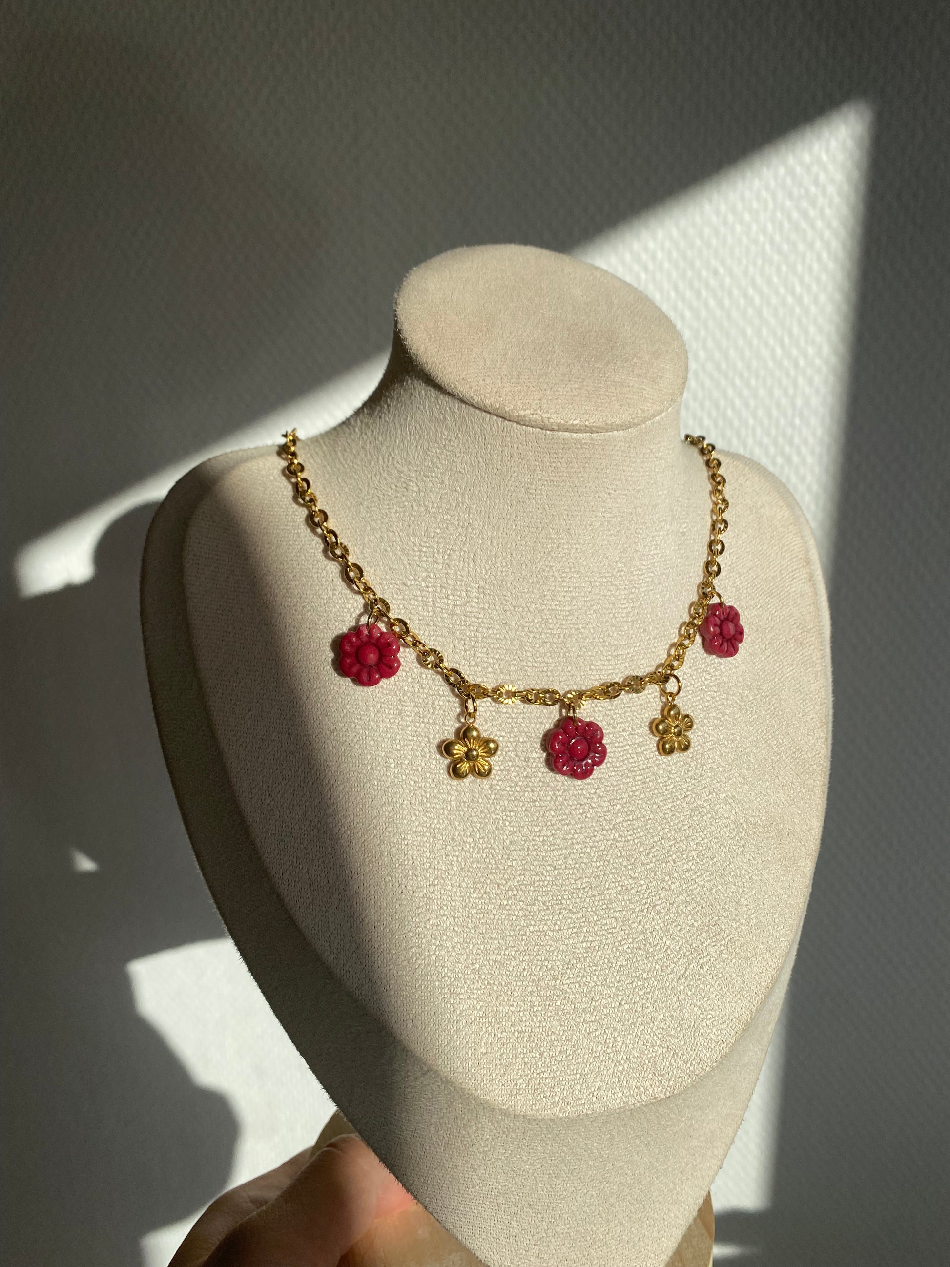 Découvre notre collier Sandie , une création entièrement imaginé autour des fleurs. Une création unique et élégante qui mélange le côté brillant de l'acier inoxydable doré et le côté artisanal et coloré avec les fleurs bordeaux en pate polymère.