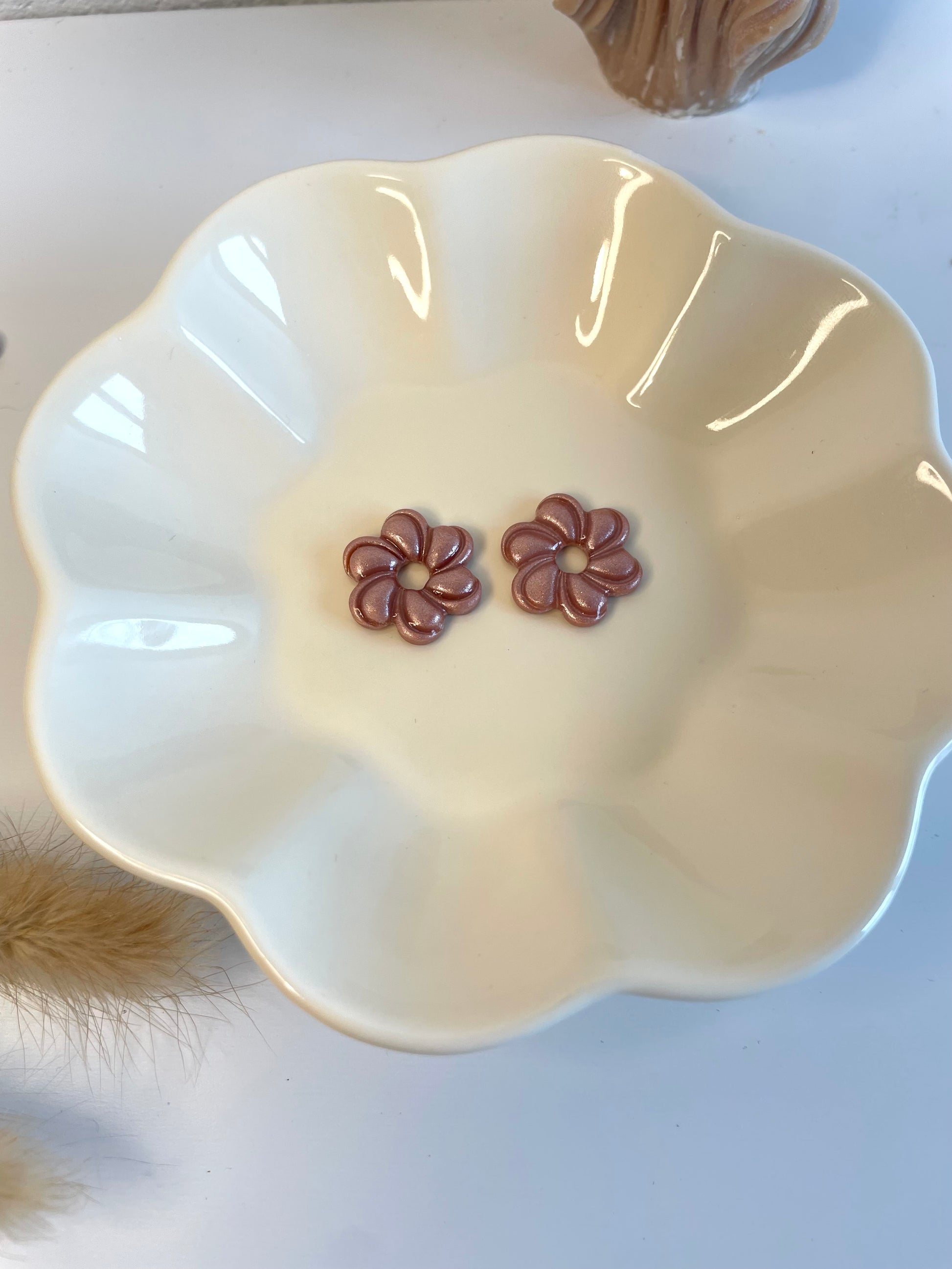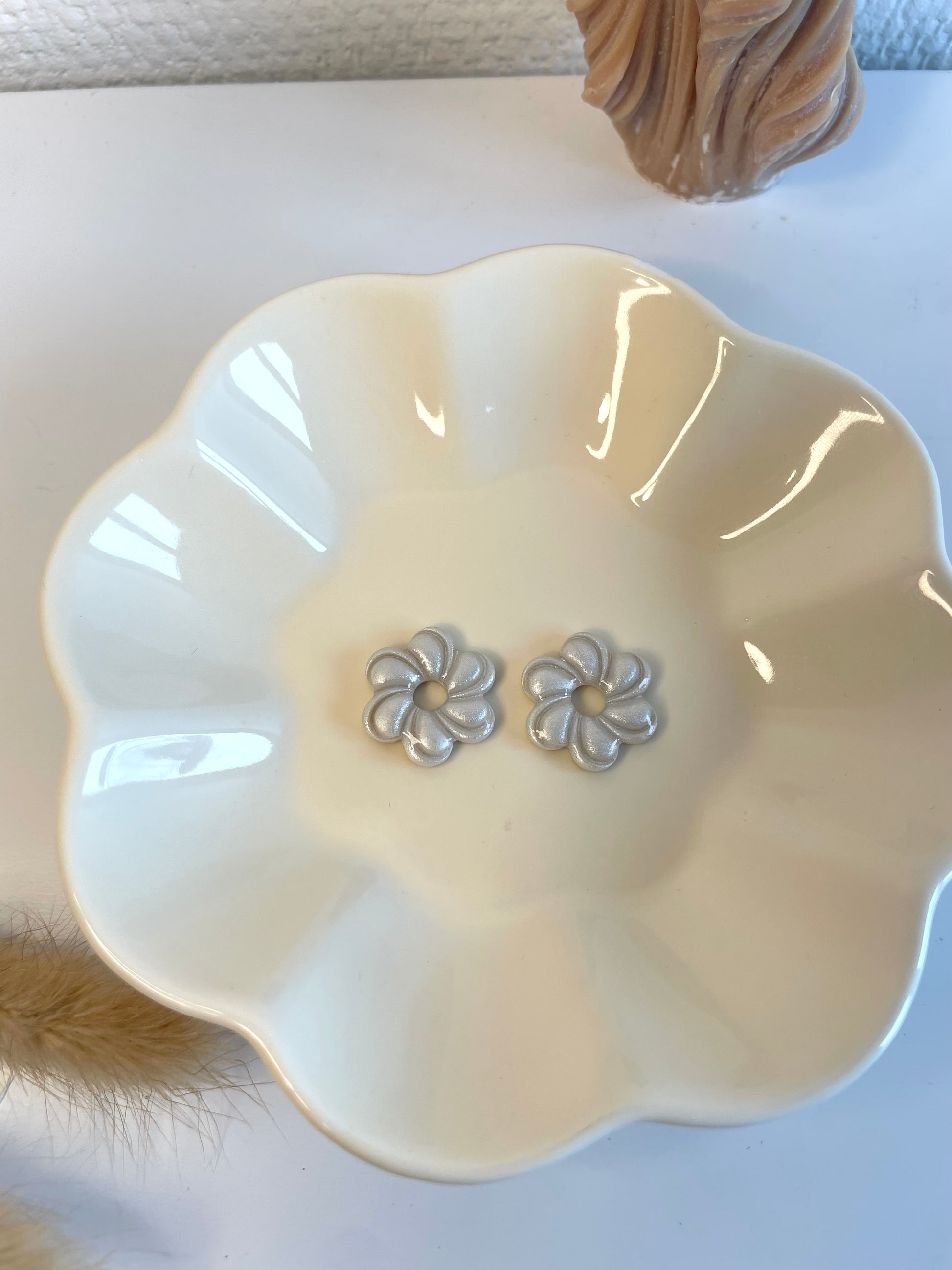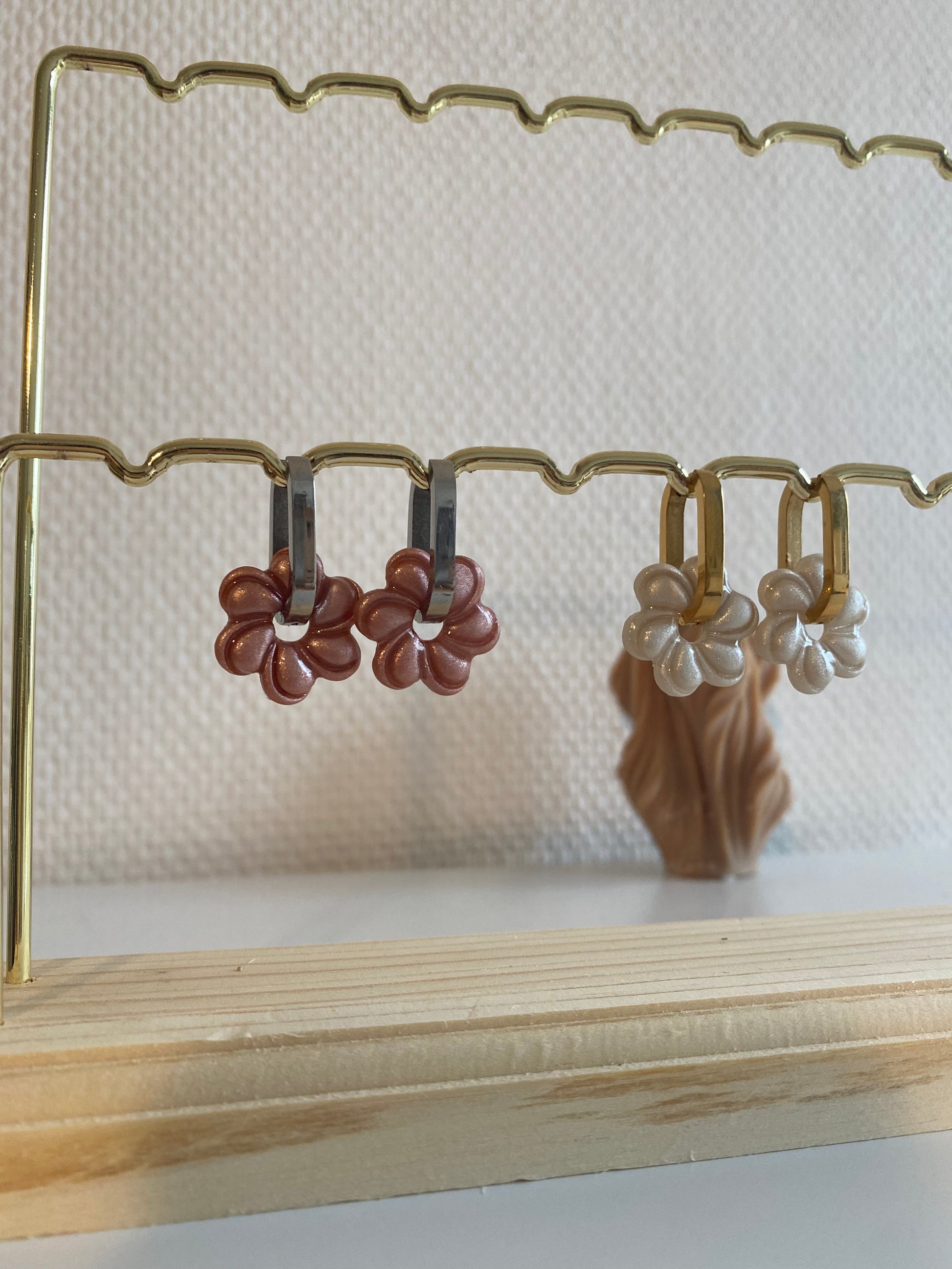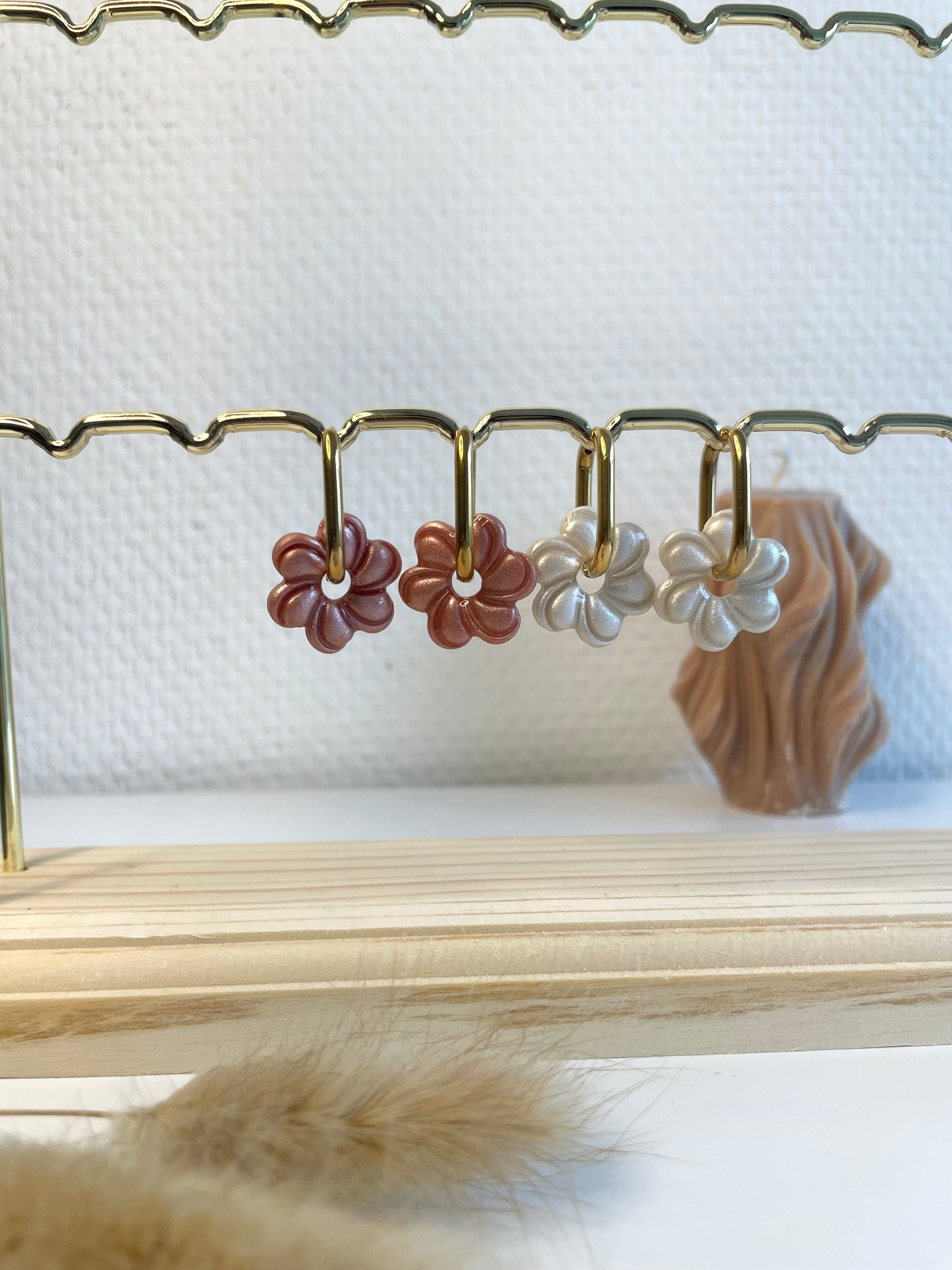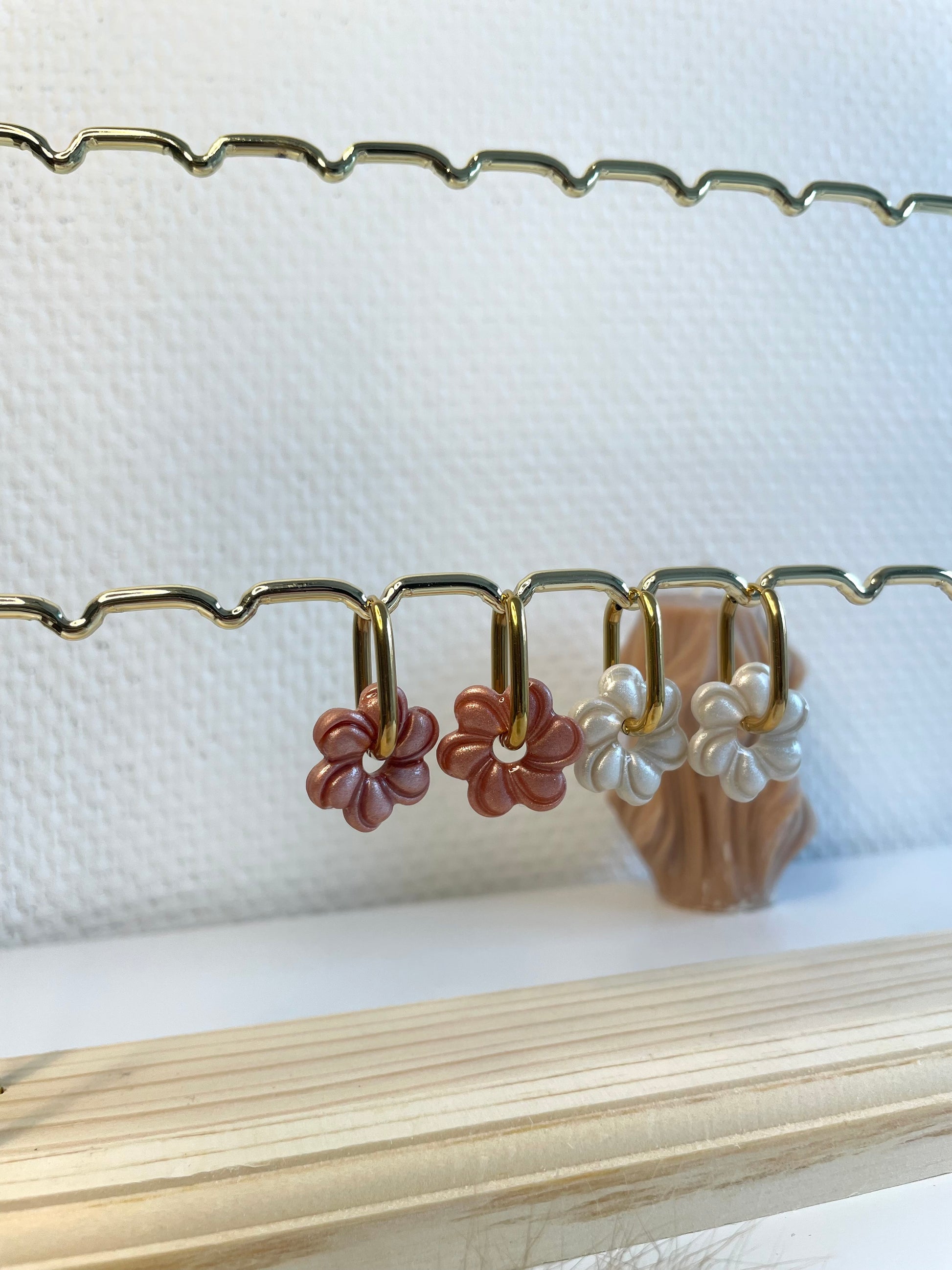 Découvrez les Valéry , nos nouvelles fleurs nacrés interchangeables. Présentées sur le portant avec les créoles Abby.